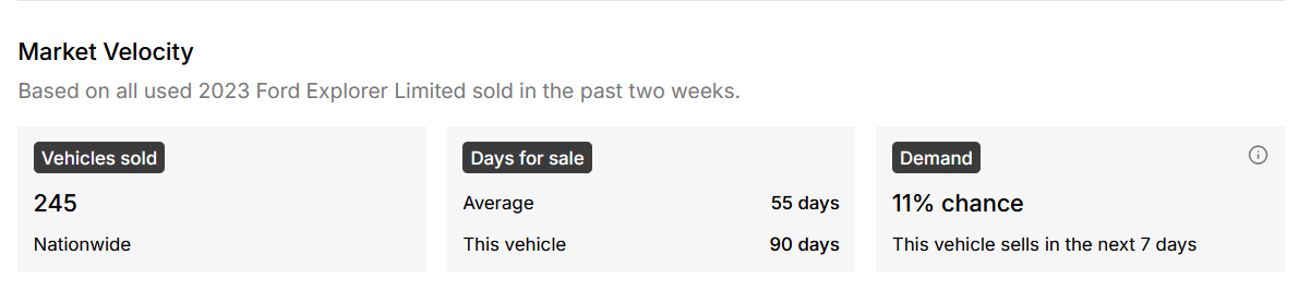 Visor then takes the raw data a step further by adding market context around it. For example, seeing that a 2023 Ford Explorer Limited has been for sale for 90 days is useful (slightly). But actually knowing that the average Explorer sells in just 55 days? That insight is unique. It immediately sparks the right questions: “Is there a mechanical issue causing it to sit?” or “Is this dealer padding the deal with hidden fees and add-ons?”