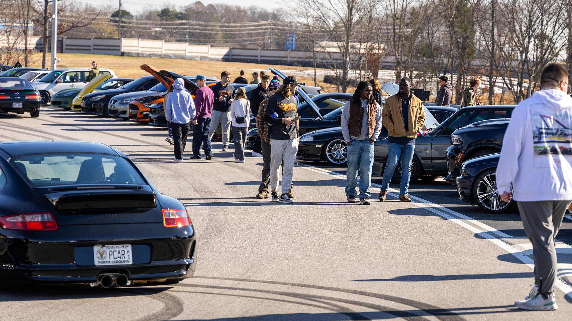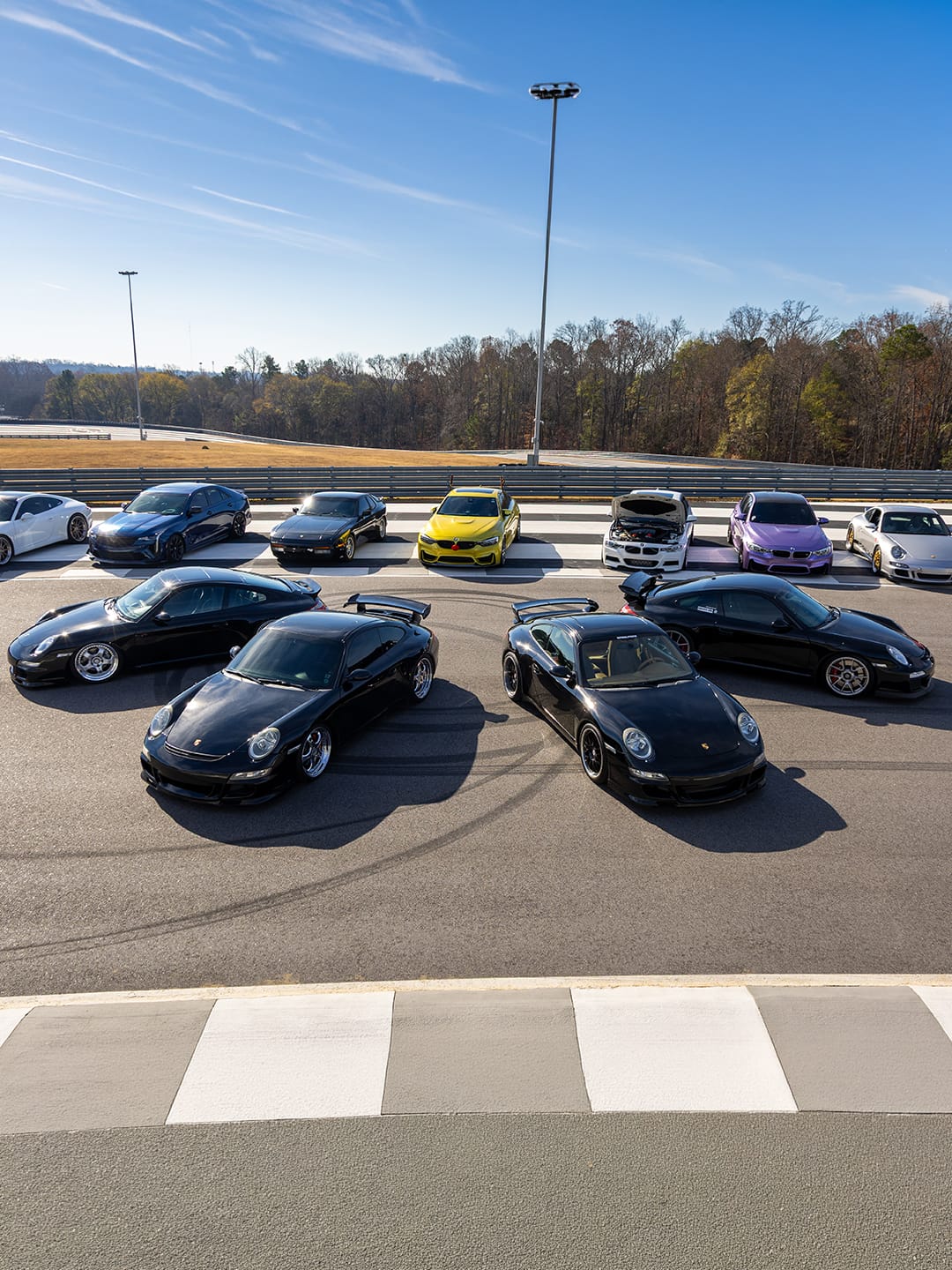 If you made it past that, you’d likely look over the railing expecting a quiet track, but instead, you’d see the circuit filled with participant cars and a curated lineup of early 2000s 911s. The cars lined both sides of the track, making every drive through feel like a safari through mechanical legends. Fans cheered not only the turnout but the diversity of the cars. The mix ranged from high-end 911s and classic BMWs to JDM icons, muscle cars from every era, and even oddballs like a stanced 2004 Subaru Forester with a serious power upgrade.